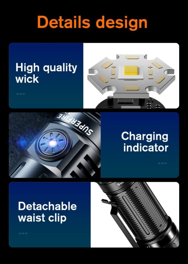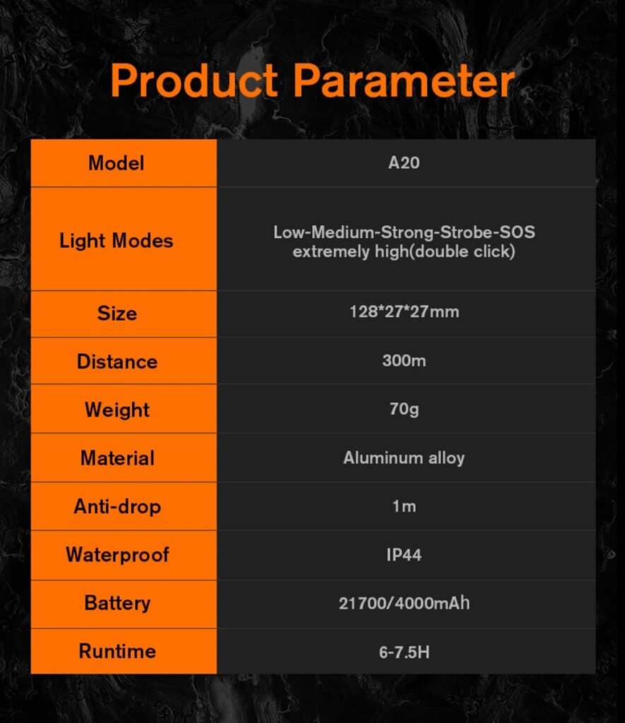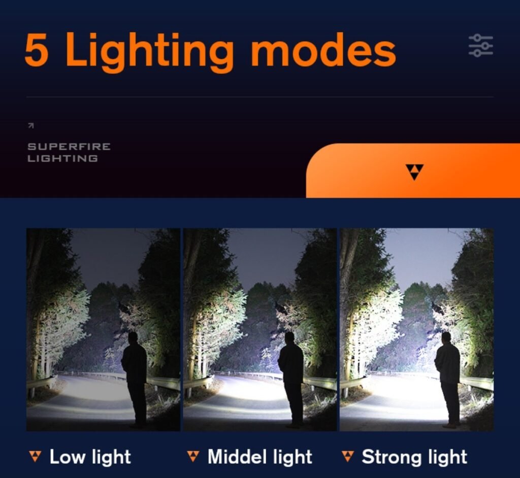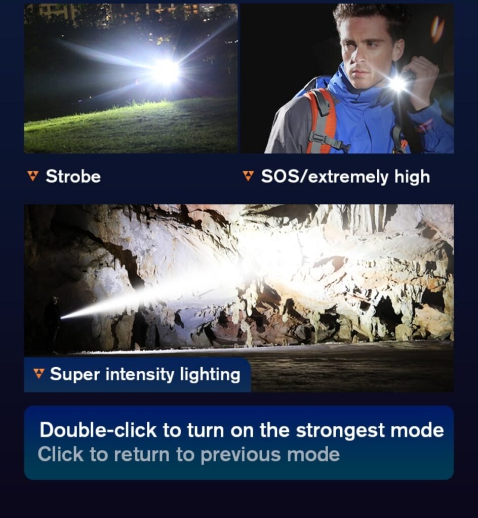 modes Low-Medium-Strong-Strobe-SOS/extremely high(double click)