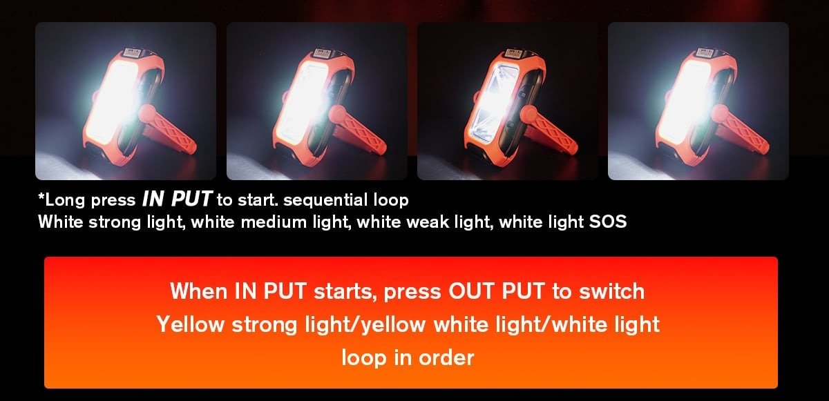 Modes Three light sources (yellow light/yellow white light/white light), each three light sources include strong light/medium light/low light/SOS