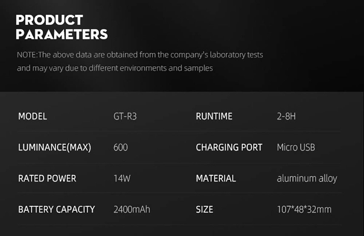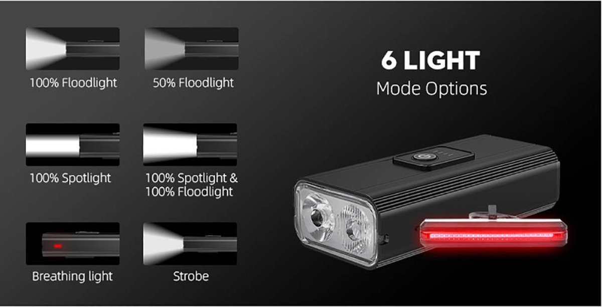 Modes 6 modes(100% floodlight>50% floodlight>100%spotlight>100%floodlight & 100% spotlight>breathing light>strobe)