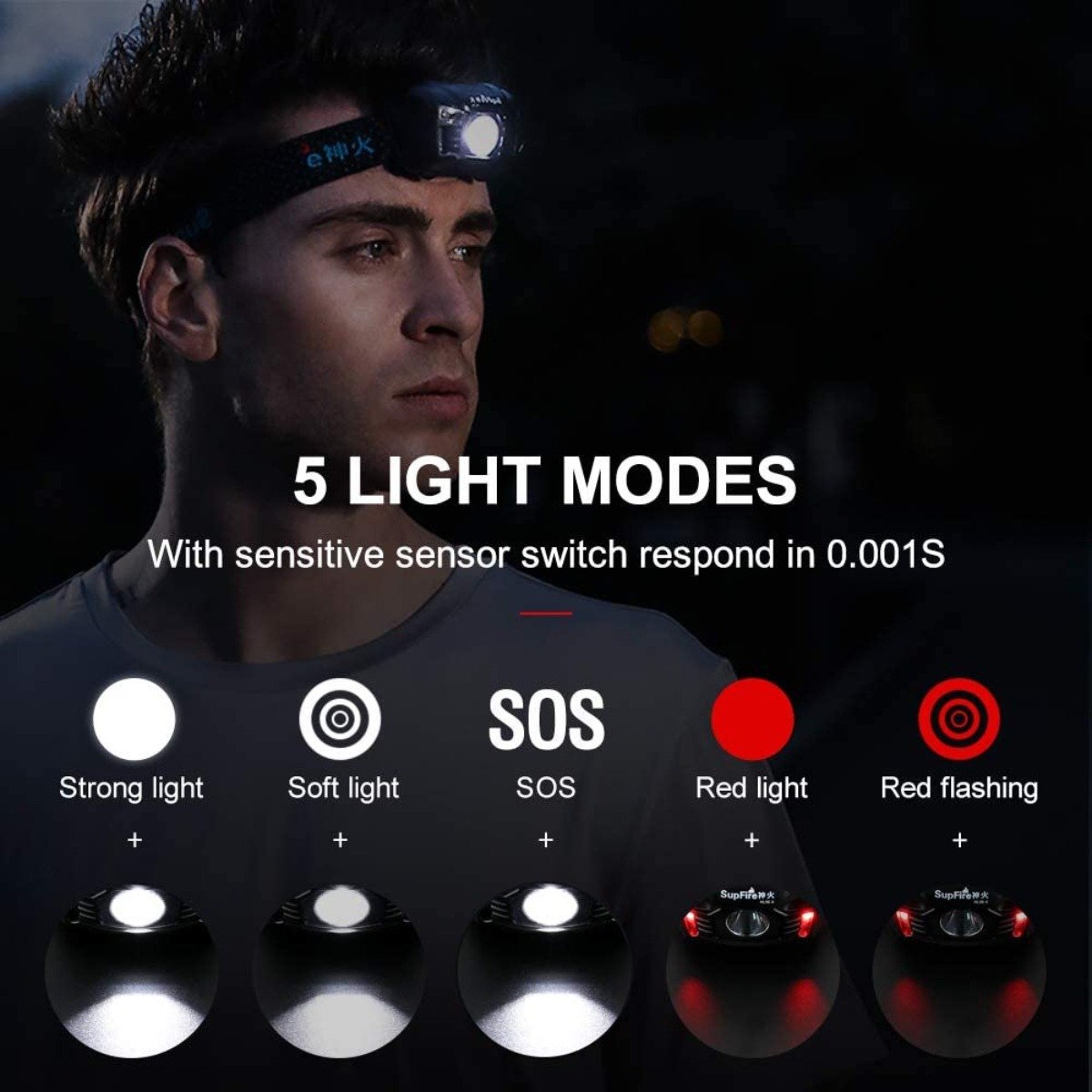 Lighting mode 5modes(High>Medium>Low>Red light>Red light Strobe)