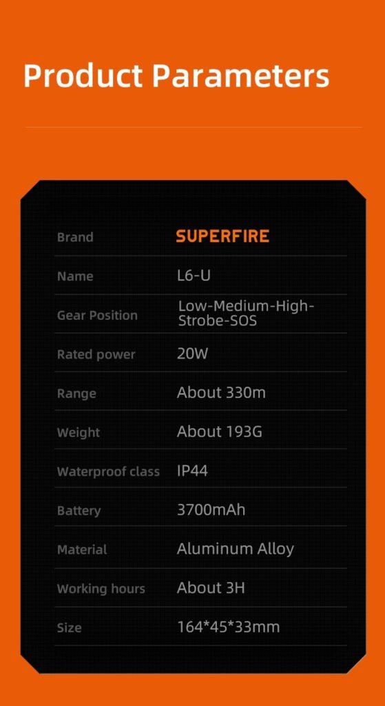 Modes   5 modes (Low>Middle>High>Strobe>SOS)