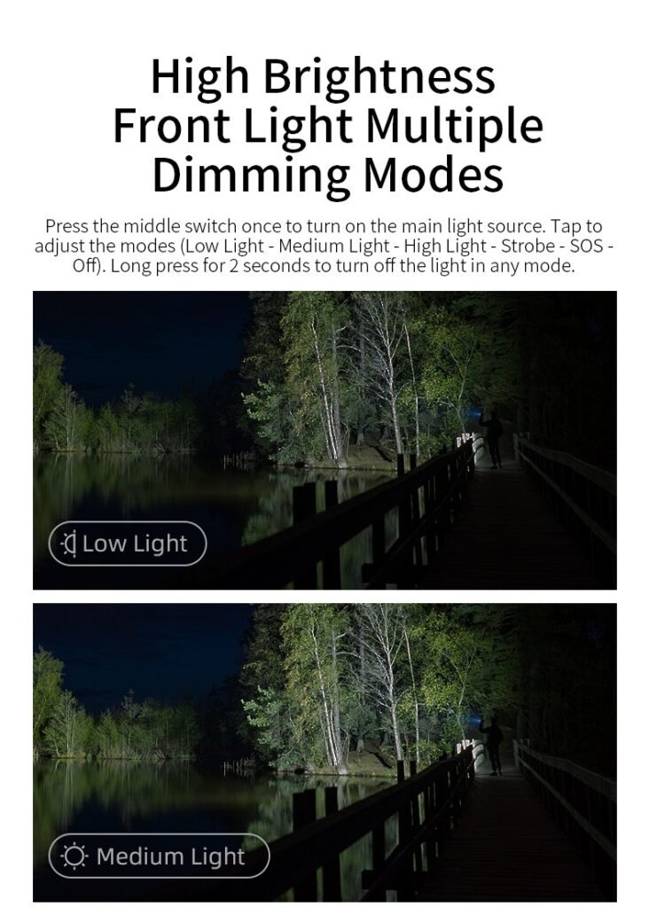 Lighting Modes Main Light, Weak – Medium – Strong – Strobe – SOS – Off;Tail Light,On/Off