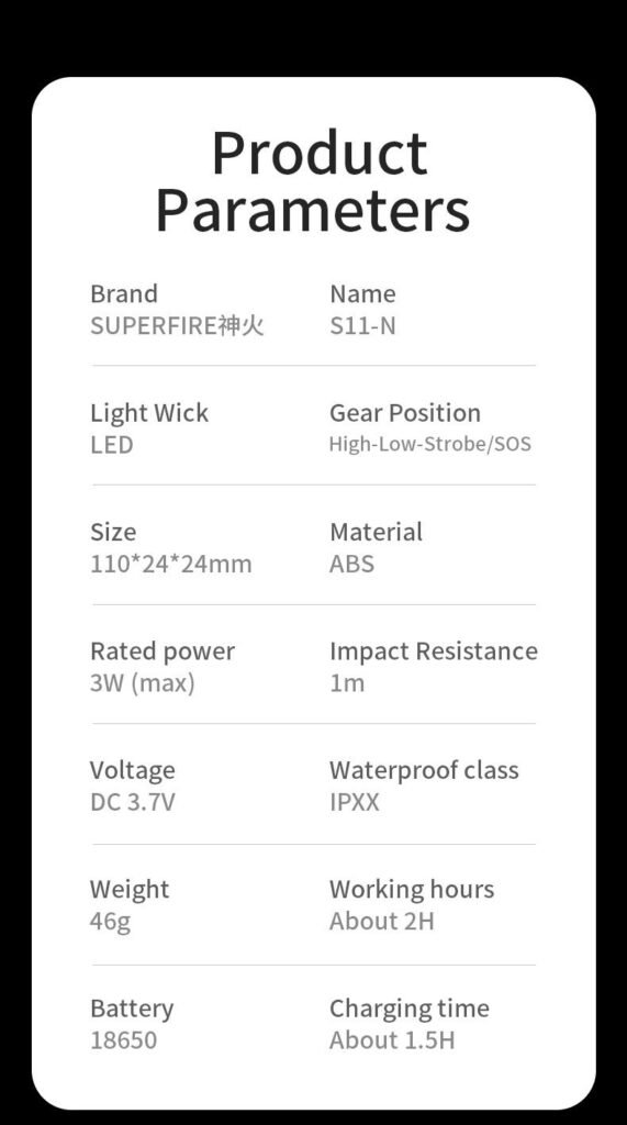 Modes 5modes (High>Middle>Low>Strobe>SOS)