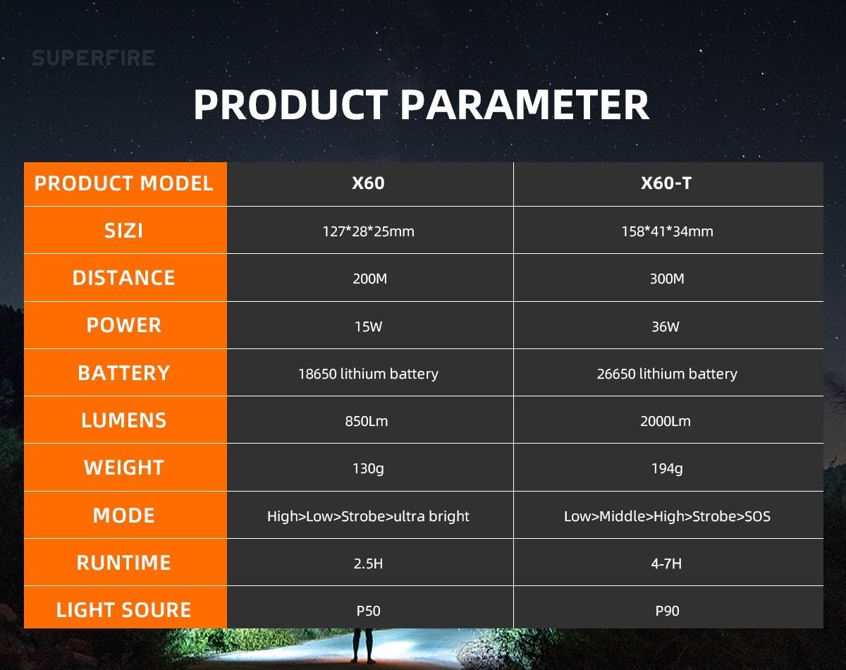 Modes 4modes(High>Low>Strobe>Double tap to turn on ultra bright mode)