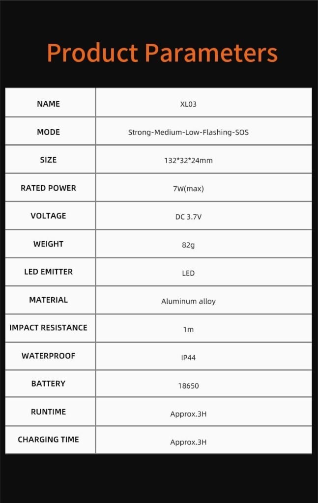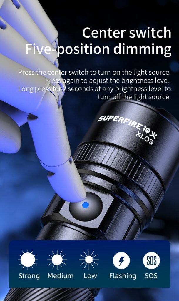 Modes Five modes including High, Medium, Low, Strobe, and SOS.