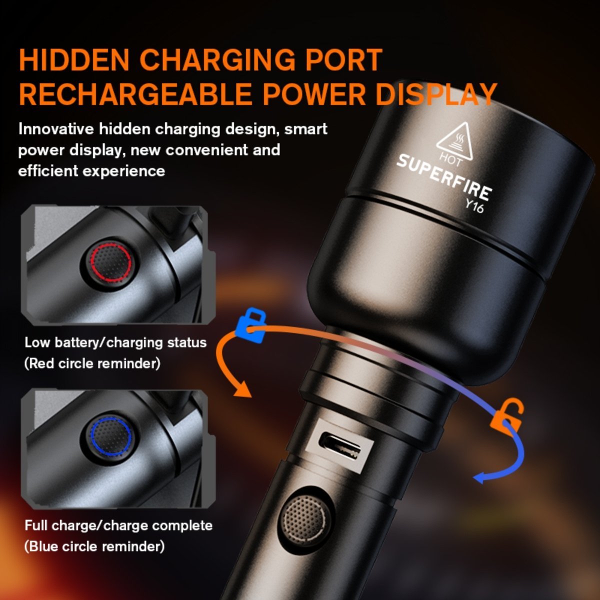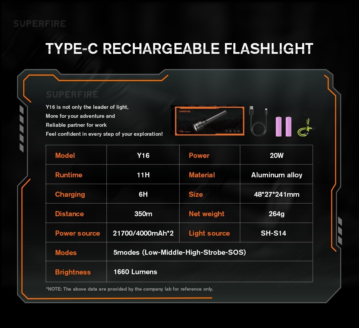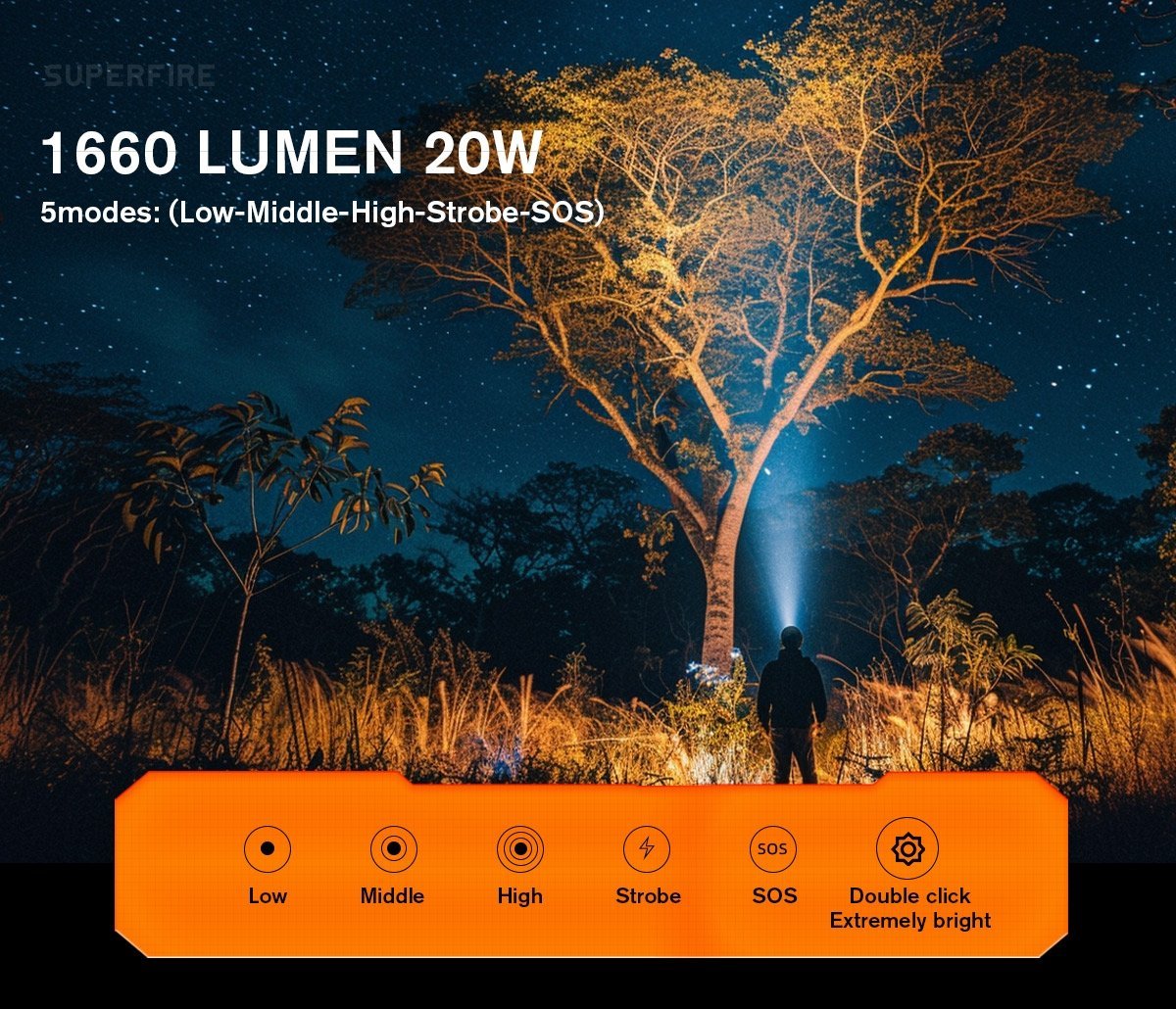 Modes 5modes(Low-Middle-High-Strobe-SOS), double-click to extremely light