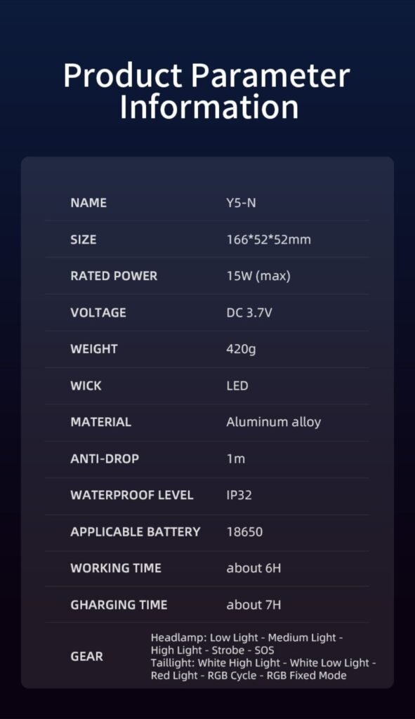 Modes 5modes(Weak, Medium, Strong, Strobe, SOS) ,Taillight
